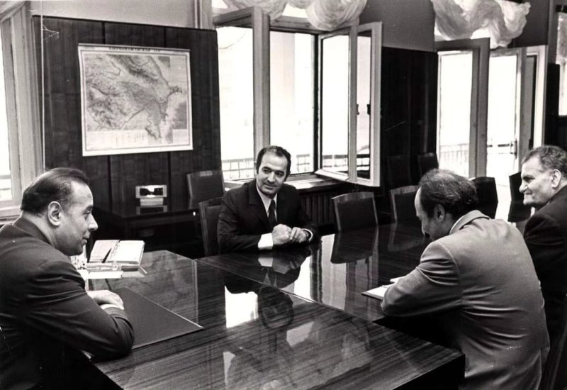 شرح عکس، از چپ: حیدر علییِف رهبر وقت جمهوری شوروی سوسیالیستی آذربایجان و نامزد عضویت در هیئت سیاسی کمیتهٔ مرکزی حزب کمونیست اتحاد شوروی، انور جبراییلوف وزیر امور خارجهٔ وقت آن کشور، نورالدین کیانوری، دبیر دوم وقت حزب تودهٔ ایران، غلامیحیی دانشیان صدر فرقهٔ دموکرات آذربایجان. زمان: ۱۶ دی ۱۳۵۷. مکان: باکو، کاخ ریاست جمهوری.